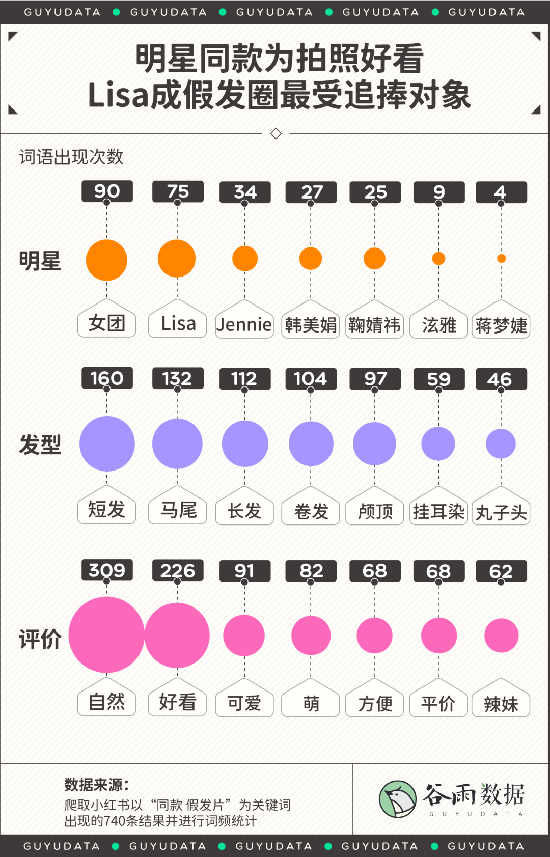 Blackpink另一成员Lisa连同其他偶像、明星则在今年带动了挂耳染的热潮。价格便宜、颜色多样、可操作性强的假发片成为不用漂染也能美丽的“完美替代”。谷雨数据今年4月以小红书“同款 假发片”为关键词进行分析,“女团”、“Lisa”、“Jennie”出现频率最高,Lisa成假发圈最受追捧对象。