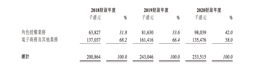 凭借这些IP形象,德盈首先便做起了IP授权的生意,之后2015年才顺势开始了电子商务及其他(自营衍生品)业务。招股书数据显示,德盈的IP授权业务营收从2018年的31.8%已增长至2020年的42%,达到了9800万港元,几乎已是支撑起了总营收的“半壁江山”。