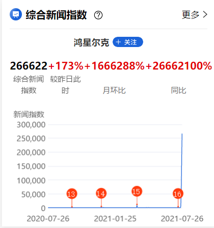 百度搜索指数显示,过去一周“鸿星尔克”整体日均值382405,同比增长42301%;同花顺iFind显示,鸿星尔克目前的综合新闻指数为266622,月环比增长1666288%,同比暴涨26662100%。