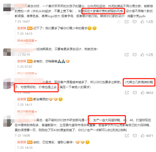 有网友在吴荣照的微博下留言称,“希望产品款式设计可以简约一些,色系搭配上可以不用饱和色系”;还有网友指出,“希望生产一些大码篮球鞋”、“可以拓展拖鞋等品类”。