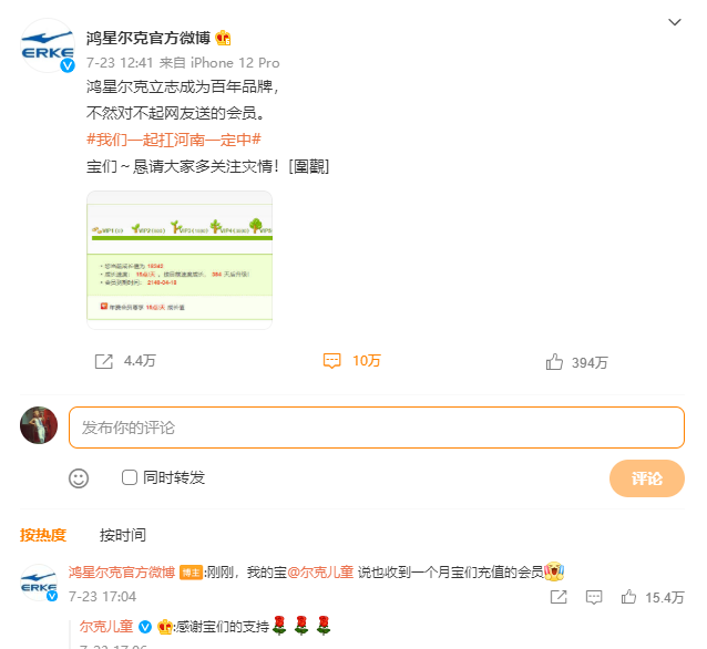 于是在网友们的集中发力下,目前鸿星尔克的微博会员年限被充值到了2140年。而公司发布的感谢微博获得了10万条评论、394万点赞,其中高赞网友表示,“鞋子质量还是要说一下,2012年在他家买的鞋子,今年就坏了”、“微博都不一定能活那么久”。