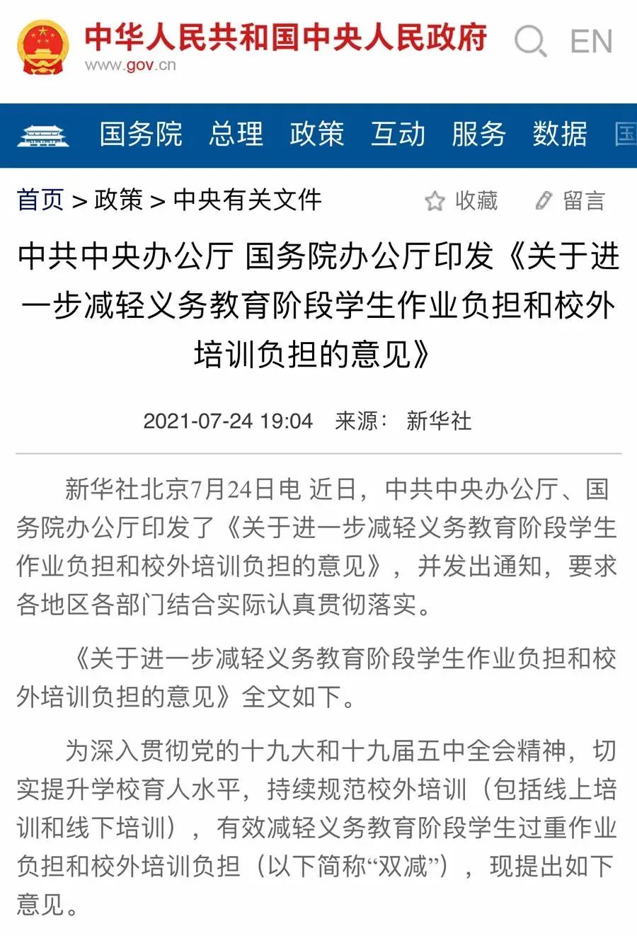 上周六(7月24日),中共中央办公厅、国务院办公厅印发的《关于进一步减轻义务教育阶段学生作业负担和校外培训负担的意见》正式发布。这份被业内称为“双减”的文件此前已经小范围流传,并造成新东方、好未来、高途等教育股深度调整。