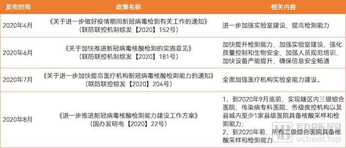 国家卫健委在2020年4月、6月、7月多次发布政策要求加强实验室建设,9月,国务院联防联控机制印发《进一步推进新冠病毒核酸检测能力建设工作方案》,其中强调“到2020年9月底前,实现辖区内三级综合医院、传染病专科医院、各级疾控机构以及县域内至少1家县级医院具备核酸采样和检测能力。到2020年底前,所有二级综合医院具备核酸采样和检测能力,完成城市检测基地和公共检测实验室建设”。PCR实验室资源下沉成为加强基层检测能力的一大工作重点