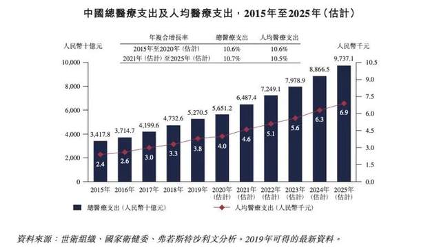 伴着经济发展的强劲东风,过去五六年中国总医疗支出及人均医疗支出以10.6%的复合增长率平稳快速增长,2020年支出总额已至5.65万亿元,该增长率将会维持到至少2025年,医疗市场总额将被推上9.74万亿的又一高点。