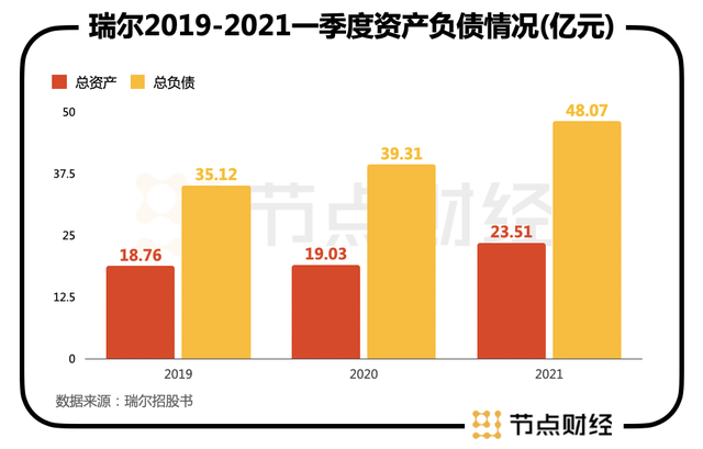 瑞尔出现资不抵债的问题已经持续了一段时间,至少报告期的三个时段中一直存在。截至2021年第一季度末,公司总资产23.51亿元,负债总额是资产的两倍有余,足有48.07亿元。