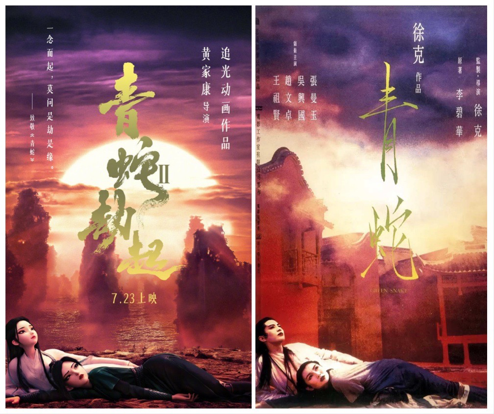 在水汽氤氲的山峦河畔,青白二蛇匍匐于地,相依相偎仰望天空。这一版《白蛇2:青蛇劫起》的海报,正是向28年前徐克版《青蛇》的致敬。