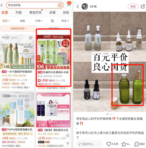 譬如,不论是在淘宝还是在小红书搜索关键词“学生党护肤”,都会出现百雀羚等国牌的身影。“螳螂财经”大致浏览了一下,在这一词条下,排在前面的基本都是自然堂、薇诺娜,以及近两年火起来的RNW、瑷尔博士等国牌,很少会看到国外品牌。