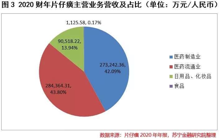 根据片仔癀2020年年报,其经营布局被概括为“一核两翼”,一核是医药制造业,主要是片仔癀系列;两翼是日化和保健品。在2020财年,片仔癀各主营业务的营收占比如下图3所示。其中,医药制造业营收比2019年增长20.25%,毛利率为77.63%,在这个部分肝病用药的占比最大,接近93%,毛利率为81.95%,营收增速为16.44%;医药流通业的营收增速为2%,毛利率为8.86%;日化营收增速为42.49%,增速较高,毛利率为42.65%,但与此同时,这部分业务的营业成本也大幅增加,增速为87.54%;食品的营收增速为3.8%,毛利率为19.6%。
