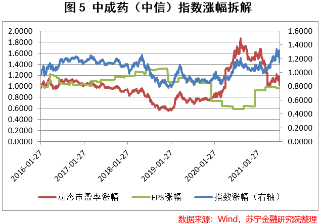 我们根据P(股价)=PE(市盈率)*EPS(每股盈利)对片仔癀的股价变动进行了拆解(见图4),从图4可以看出,最近一年来片仔癀股价的上涨主要来源于估值的上涨,这个时候我们就需要判断这是投资者对片仔癀这一家公司有所偏好,还是对这一类公司有所偏好。也就是要比较片仔癀和其可比行业或公司的估值变动情况。我们根据自由现金流、ROE/ROIC、营收和利润增速这三个指标来筛选与片仔癀可比的公司,我们发现中成药(图5)、白酒(图6)这两个行业可作为片仔癀估值参照系。