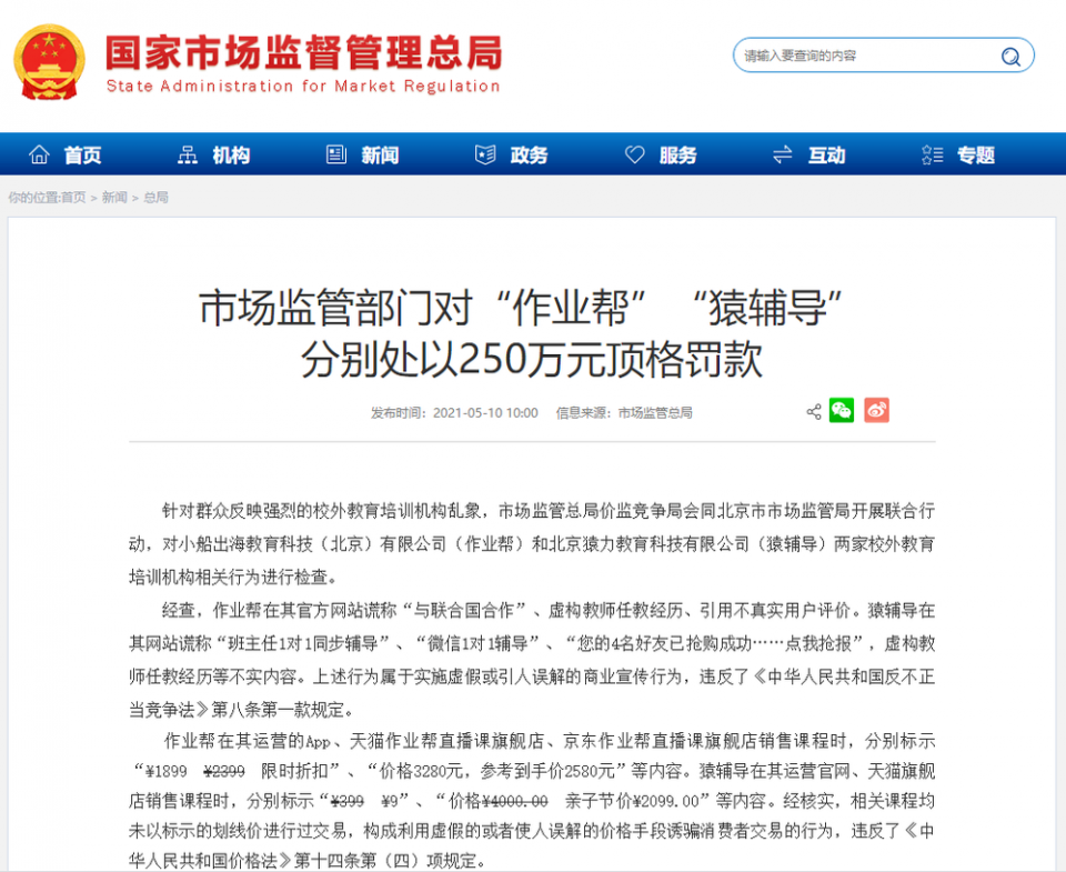 还有今年5月,作业帮和猿辅导分别被市场监管部门处以250万元的顶格罚款。处罚原因包括谎称“与联合国合作”、“班主任1对1同步辅导”、虚构教师任教经历等不实内容,以及销售课程时标出原价和折扣价等价格手段诱骗消费者,被判违反了《反不正当竞争法》和《价格法》等相关条款。