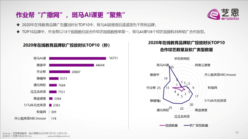 根据艺恩数据,2020年在线教育品牌软广投放综艺时长前三的是斑马AI课、跟谁学和作业帮直播课,其中作业帮以13个综艺位居合作数量第一,包括《向往的生活第四季》《奋斗吧主播》《奔跑吧第四季》等;斑马AI课以6个合作综艺建立了35种软广合作类型,包括《幸福三重奏3》《中餐厅第四季》《哈哈哈哈哈》等。