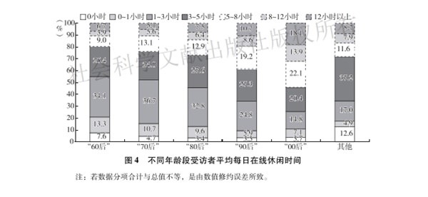 2020年,社科院发布了一份研究报告。报告指出,2019年到2020年,中国平日人均休闲时长3.6小时,而平均在线休闲时间却长达4.9小时。其中60后、70后及80后在线休闲时间为1~3小时的人最多,90后在线休闲时间为3~5小时的人最多,00后在线休闲时间为5~8小时的人最多。