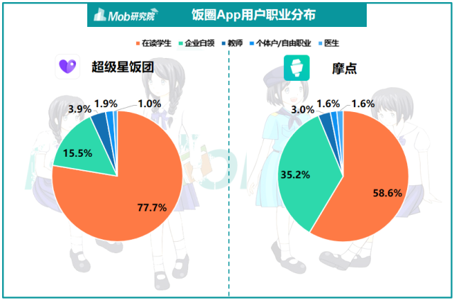 Z世代大多属于前者,她们是追星群体核心的主体。在超级星饭团与摩点App这两款饭圈APP上,我们看到,超级星饭团用户中在读学生数占比达到77.7%,摩点稍低,占比达58.6%。这种用户结构其实和不同年龄段的在线休闲时间一致,00后的在线休闲时间最长。