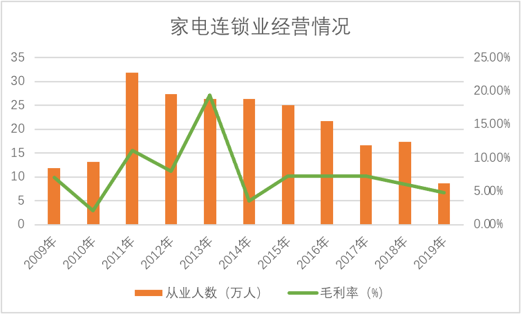 我们可以确切看到,家电连锁就业人数是在不断下降的,且毛利率较高点也压缩了大半,2019年门店数量也回到了2011年的水平。