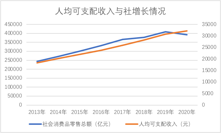 经过2019年的恢复,2020年社消又遭遇了极大的冲击,呈明显的下降态势,而当年虽然可支配收入增速有所下降(主要为疫情因素),但收入仍然是在增长区间的,也就是说,收入增长而社消却在萎缩。