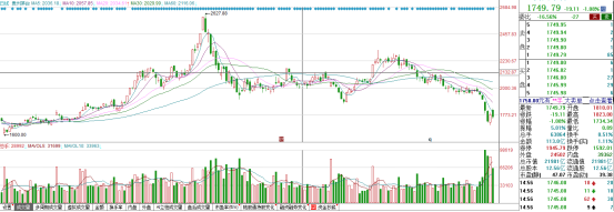 个股上,除了二三线白酒如水井坊、山西汾酒、口子窖、洋河股份等跌幅较大之外,一线“茅五泸”跌幅也较为惨烈。其中茅台跌破了前期5月份低点,最低跌破1700,今日收盘价1749.79,下跌1.08%。五粮液则下跌更为凶猛,自22日收盘至今已下跌16.07%。