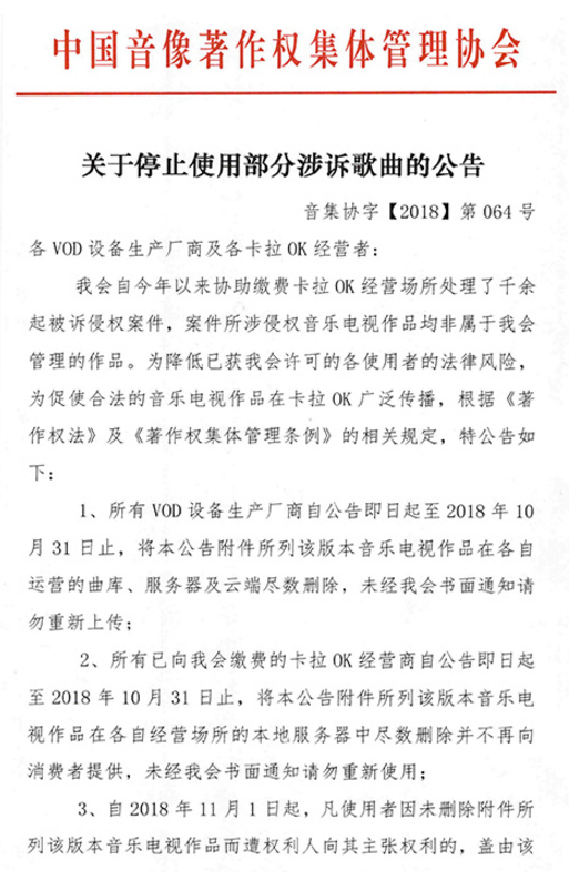 2018年,才刚刚重整旗鼓缓过劲来的KTV行业再次遭遇当头一棒,我国唯一音像著作权集体管理组织——中国音像著作权集体管理协会发布一条公告,要求KTV终端商和经营者下架6000多部音乐电视作品。
