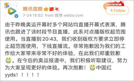 第二天下午,腾讯视频官方微博作出回应,表示“由于昨晚奥运开幕时多个网站均直播开幕式表演,腾讯也跟进了该时段节目直播,此系对点播版权超范围使用。当直播到 20:43,我们收到版权方要求立即停止超范围使用,下线直播流。”