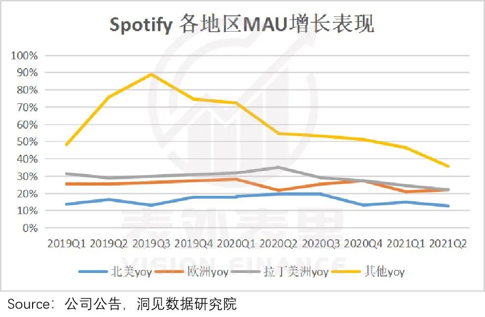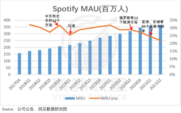 如下图,2021Q1-Q2,Spotify的MAU同比增速,持续下降。