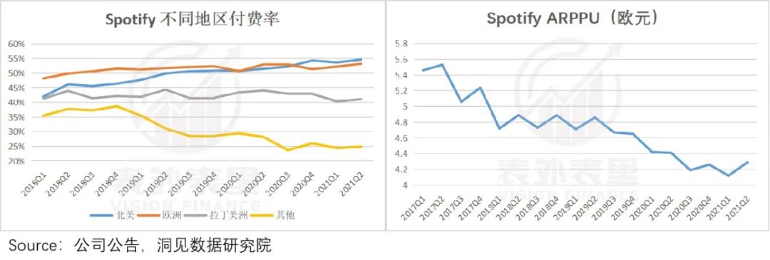 与此同时,为了在这些区域更有竞争(价格)优势,Spotify订阅服务的会员价格也不会定的太高,更别说频繁涨价。如此也拖累了Spotify整体的ARPPU值。