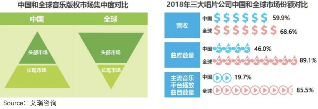 究其原因在于,就国外市场来说,三大唱片公司对音乐行业有着绝对的垄断地位。如下图,无论版权集中度,还是市场份额,大头都在三大唱片公司手中。
