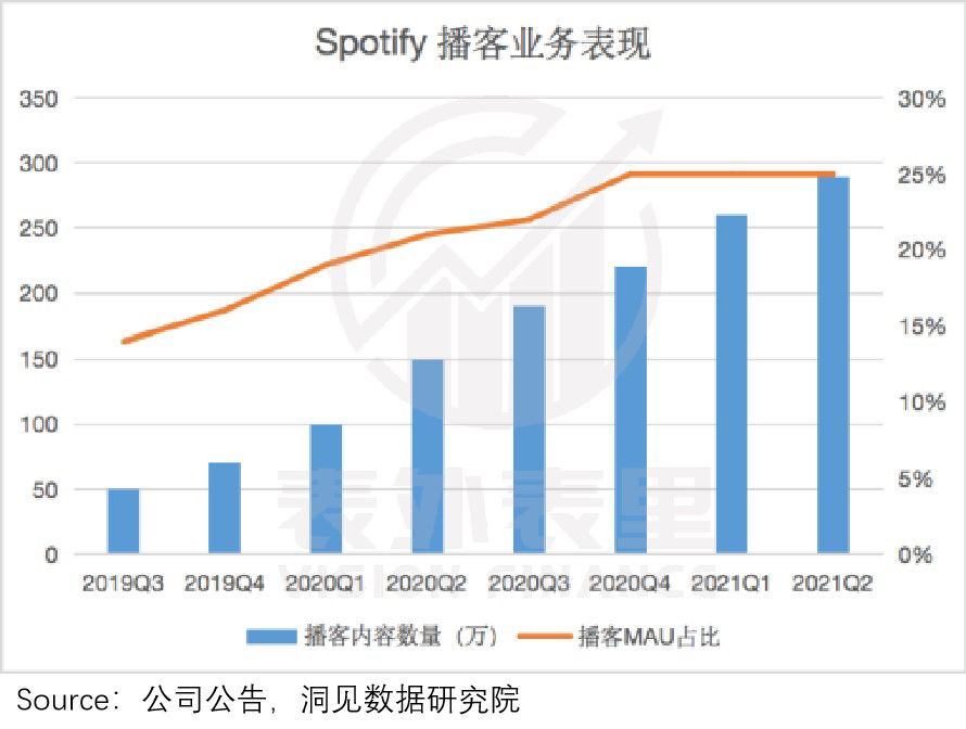 通过采买和自制的不断扩充,Spotify的播客业务规模持续壮大,跃居全球第一。
