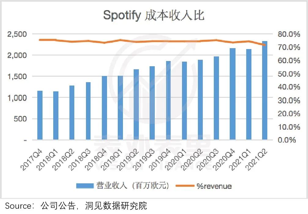 据公司公告,Spotify收入的近2/3,需要支付给音乐权利持有者。而截至2021Q2,其成本收入比,仍保持在70%以上的高水平。