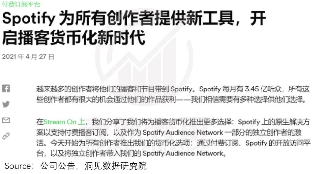以创作者端为例,Spotify推出系列货币化计划帮创作者创收,比如付费播客方案,就是由创作者自行决定订阅费用来增收。