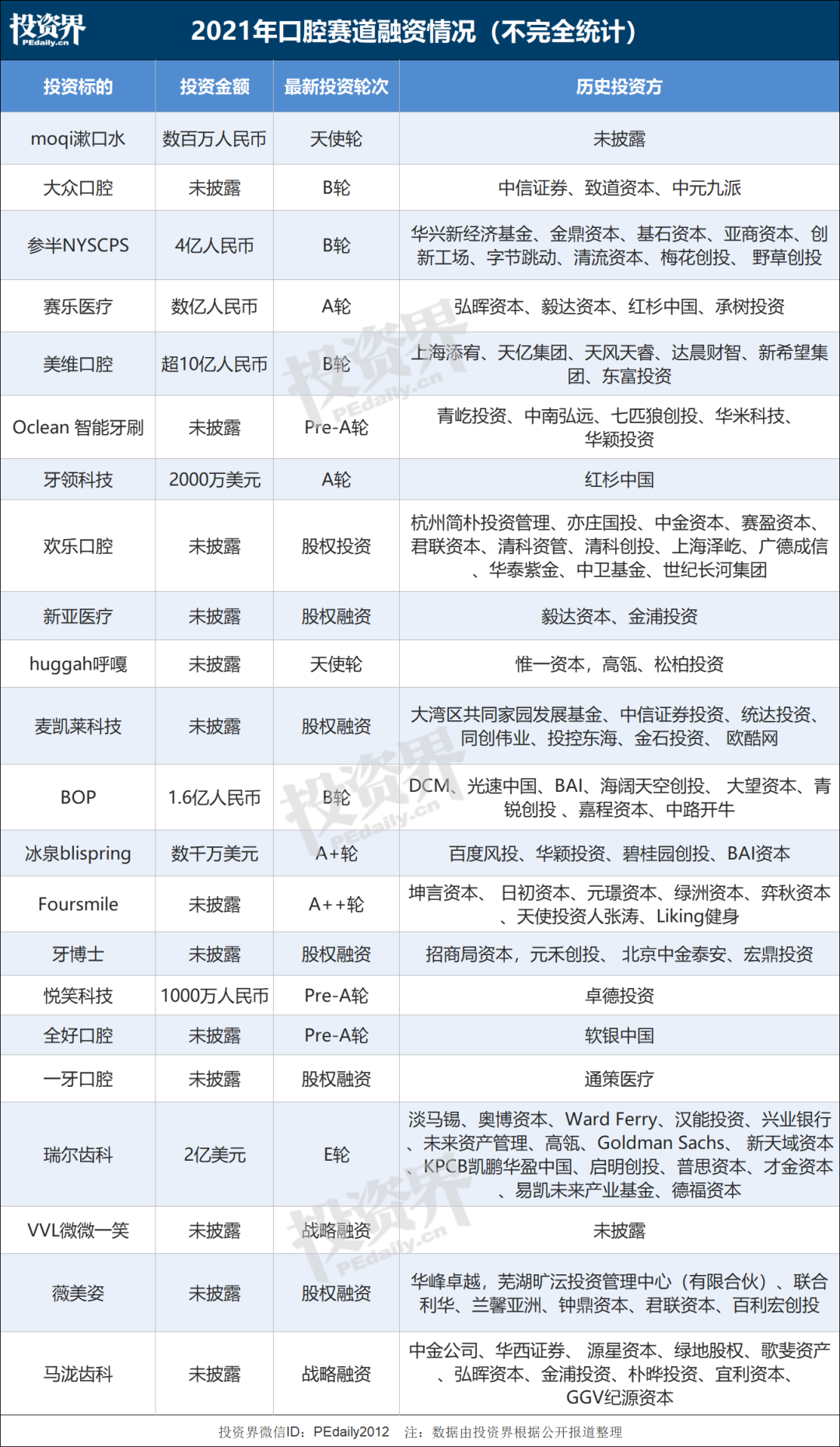 至此,不到一个月的时间,已经有5家口腔相关创业公司完成融资,身后出现了红杉中国、高瓴、达晨财智、启明创投、GGV纪源资本、毅达资本、弘晖资本、松柏投资等一众知名机构要的身影。这是罕见的一幕:投医疗和投消费的VC同时出现在这一条赛道抢项目。