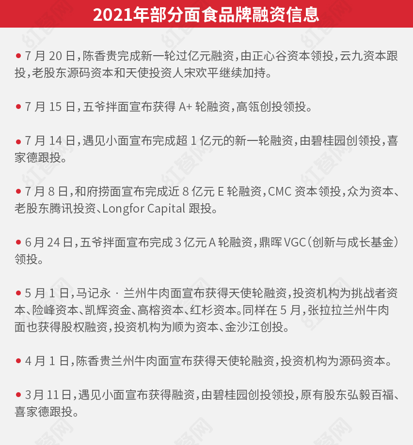 据红餐网不完全统计,今年以来至少有6家面食企业获得融资,超10亿元资金流入面食赛道。