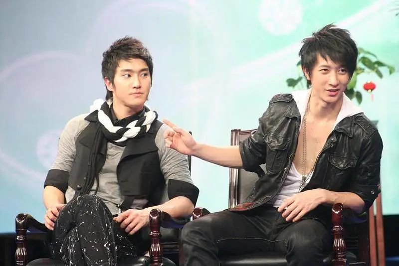 2008年,Super Junior录制湖南卫视节目。崔始源,韩庚。