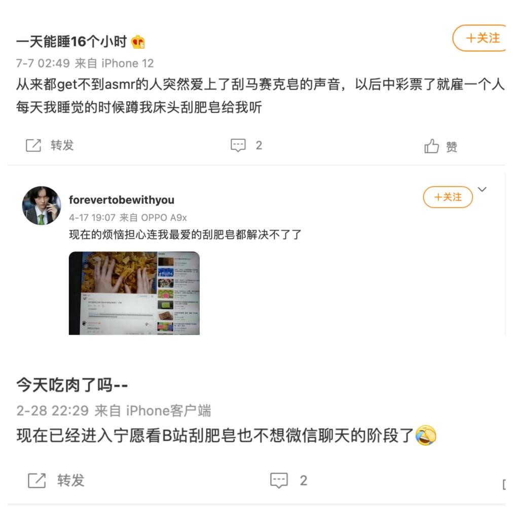 修驴蹄是门手艺活,但切割起来固然爽,可毕竟不甚美观,更受年轻人欢迎的是刮肥皂。五颜六色的肥皂被博主一层层刮掉,刮肥皂的声音和不断掉落的碎屑让不少看的人极度舒适,一位网友自称现在已经进入了宁愿在B站刮肥皂也不想微信聊天的阶段,“一天不看一点就感觉少了什么”。