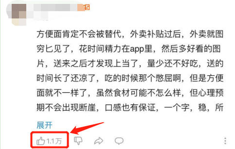 在B站一则有关方便面的视频下面,也有网友提出了类似看法。由于方便面比外卖更贴合“所见即所得”,这位网友就觉得“方便面肯定不会被替代”。