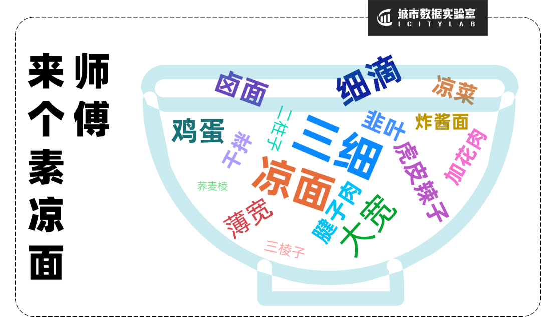 看到这,不要以为夏季的兰州牛肉面馆会纷纷进入淡季,其实每家店都有好几副面孔。一面是沸腾的煮面大锅,一面是清凉的什锦卤子,又一兰州地道美食在这里诞生了——凉面,是众多兰州牛肉面馆的第二产业。