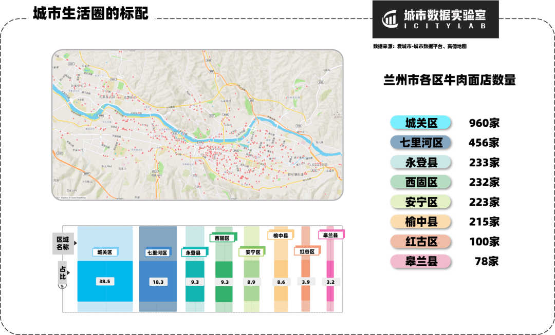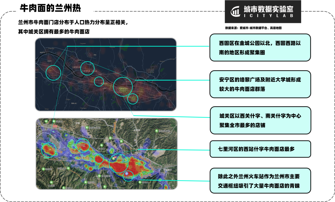 据统计,全市目前正常经营的牛肉面馆有2497家,通过兰州市人口热力分布图可以看出牛肉面馆分布与兰州市人口分布呈正相关。