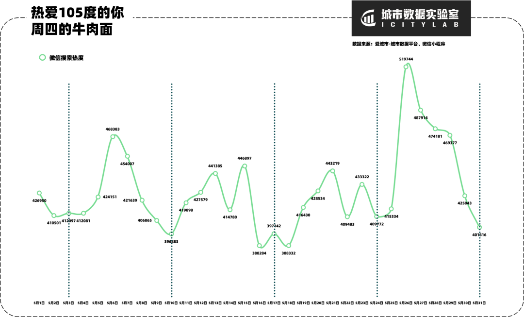 那为什么是周四呢?社会学家研究发现,在四天的工作后,身体的疲惫与迎接周末的喜悦相互碰撞,于是在周四那个阳光明媚的中午,急需调整身心迎接周末的兰州人走进牛肉面馆,来个“肉蛋双飞”的牛大,吃一口即是快乐星球。微信指数的周期性变化显示出,热度波峰出现在工作日内,波谷则出现在双休日,从此数据表现中可以推测到“牛肉面”群体多为学习和工作活动规律的学生党及上班族。