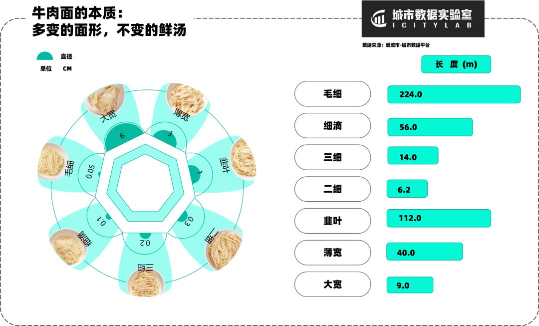 由于拉面师傅在制作牛肉面时使用的是同样大小的面团,所以越细的面条必然长度越长,给人一种“数量很多”的错觉,实际上直径越大的面条消化时间越长,就越“顶饱”。