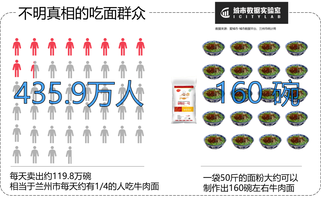 平均一袋面可以拉出160碗左右牛肉面,而做一碗牛肉面需要约160g面粉,25g肉,10克蒜苗,10g辣椒,400ml水。全兰州市每天要吃掉191.7吨面粉,一年下来要吃掉7万吨。