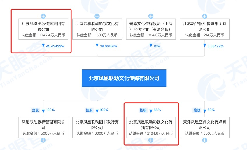 天眼查信息显示,凤凰联动影业是北京凤凰联动文化传媒旗下控股公司,凤凰联动传媒是凤凰传媒集团旗下公司,凤凰传媒集团拥有其45.43%的股份,是最大股东。