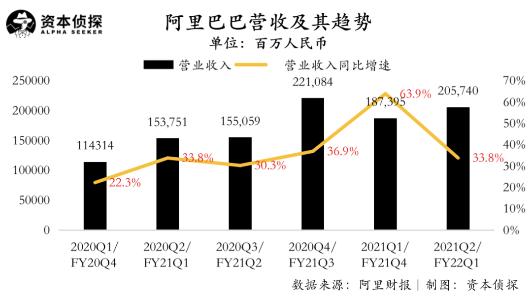8月3日美股盘前,阿里巴巴公布截至6月30日的2022财年一季度财报(即2021年Q2),财报显示: