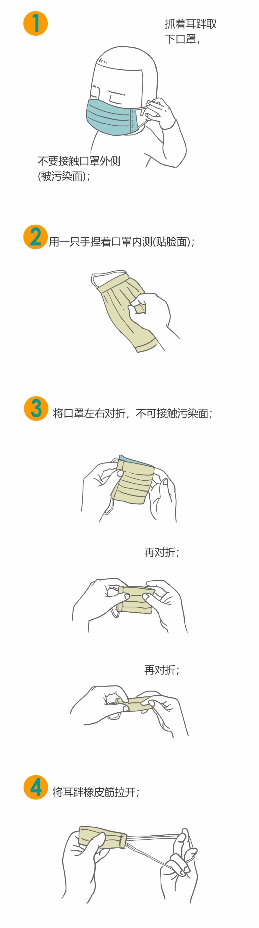 1、丢弃口罩前把耳带扯断,或按照下图将口罩折叠成块,避免动物被纠缠;