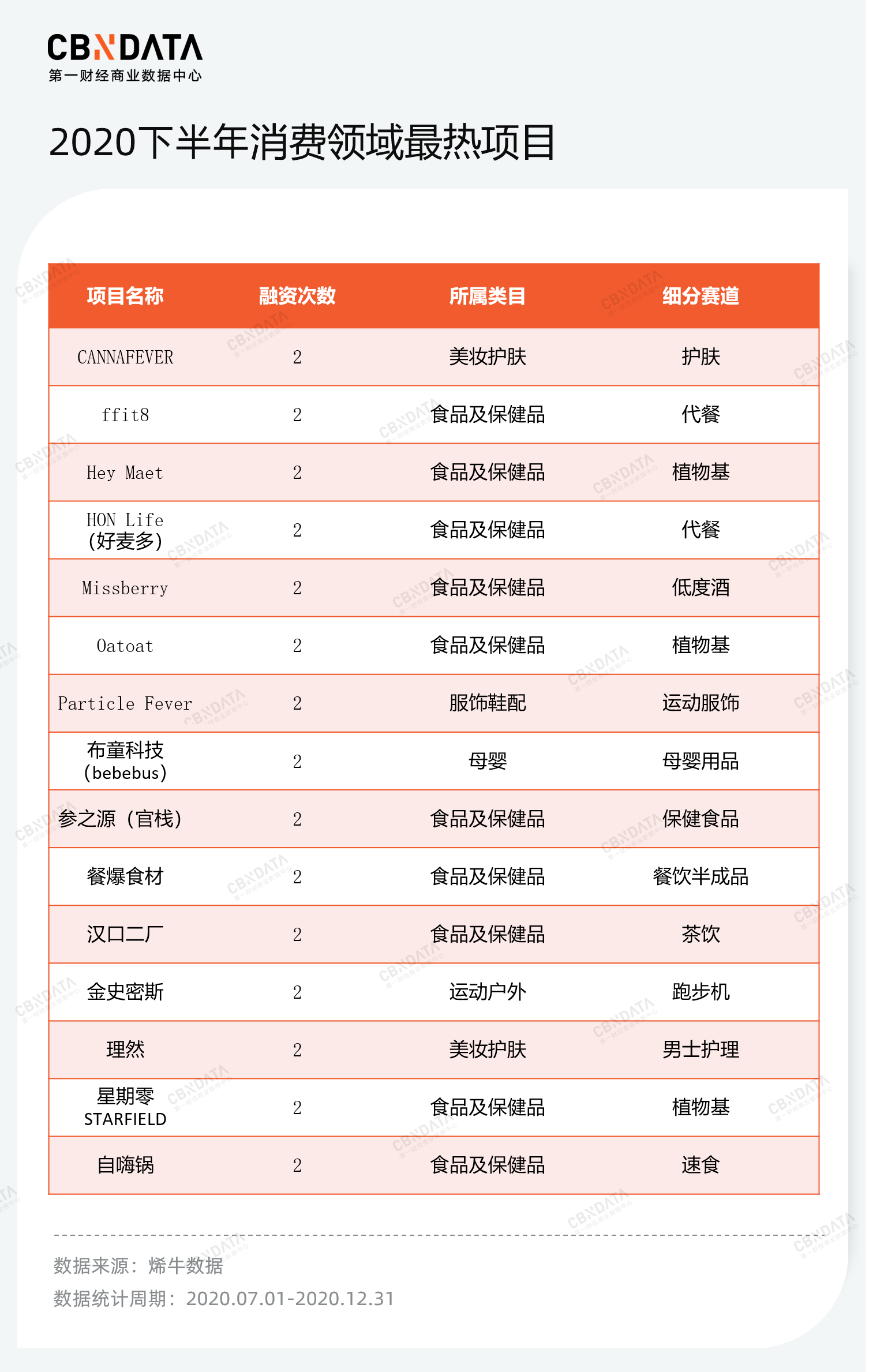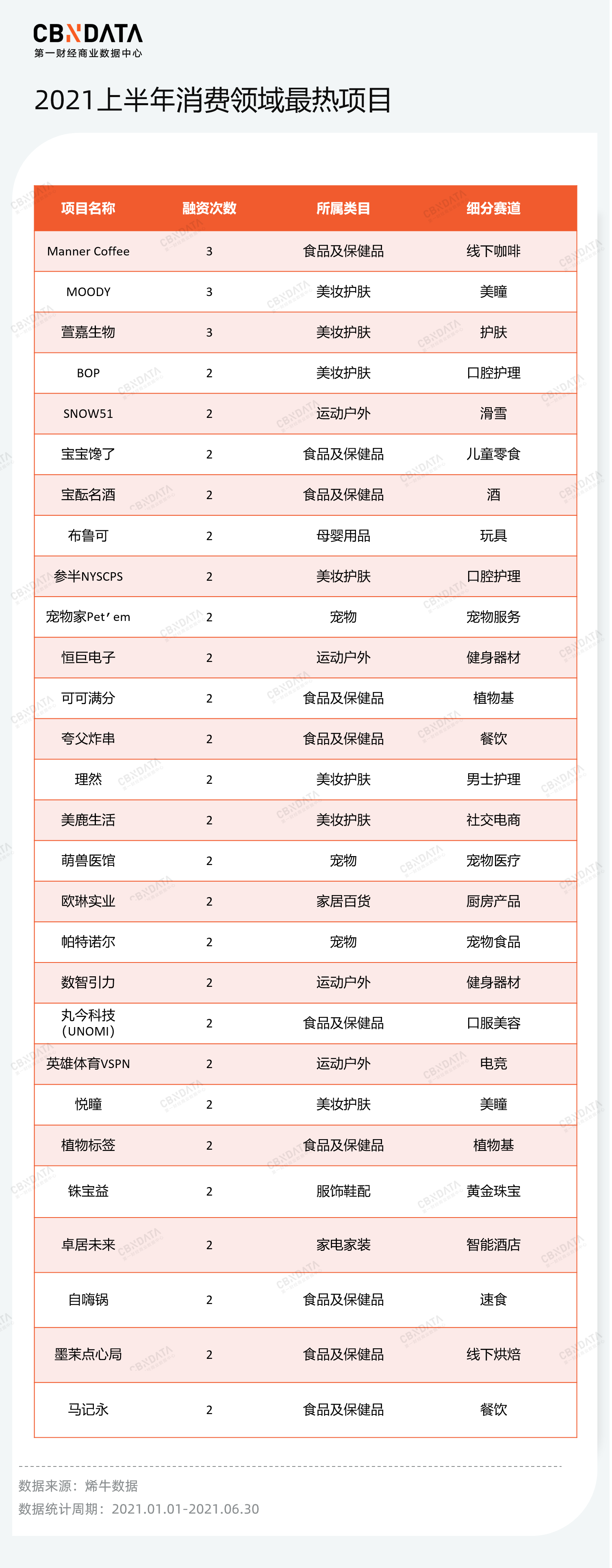 今年上半年,消费领域也涌现出了更多高频融资项目。融资轮次在两轮及以上的项目数量,较2020下半年增加87%。尽管上半年食品及保健品赛道的资本热度被显著分散,但若聚焦高频融资项目,食品及保健品品牌依旧“贡献”最大。