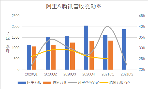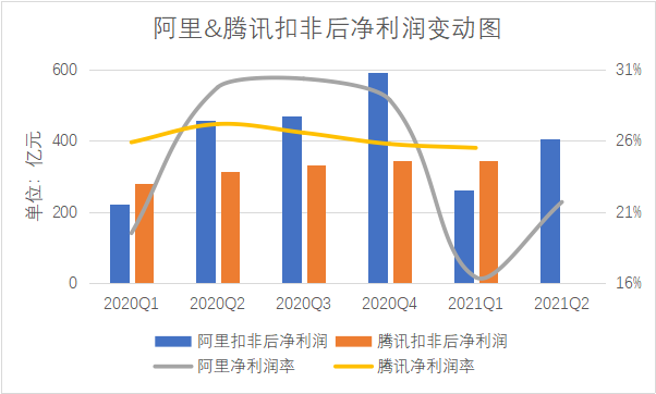 腾讯尚未公布今年二季报,但2019年一季度到2021年一季度总营收的年复合增长率约为25.82%。将两家巨头近一年来营收和扣非后净利润绝对值及同比增速放在一起对比,阿里的业绩也并不差,最近两个季度的净利润受到反垄断罚款的影响而下降幅度较大。(注:阿里集团营收绝对值和变动情况均排除了合并高鑫零售的影响。)