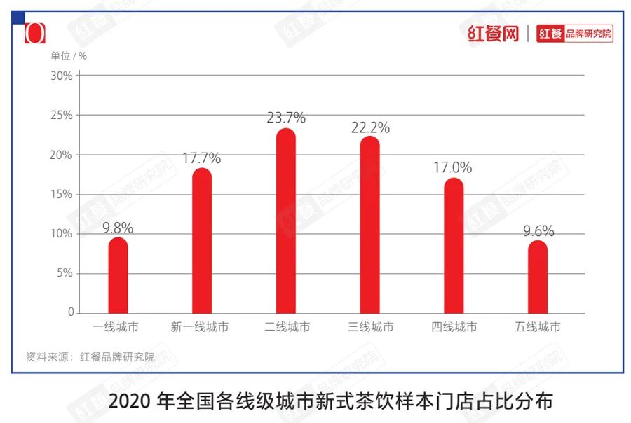 红餐品牌研究院收录的品牌数据显示,二线、三线城市的茶饮门店数占比最高,分别达到了 23.7%、22.2%,超越了一线、新一线的占比,二线及以下城市的门店数总占比超过了 70%。