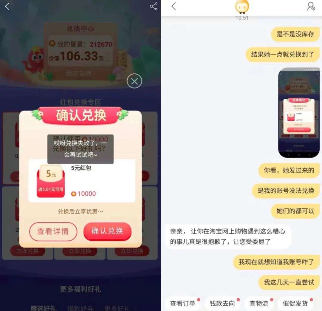 除此之外,聚划算自身的活动和规则漏洞也饱受诟病。今年6月,许多消费者集中反映,聚划算的“赚星星养红包”活动在满足条件时也无法兑换红包,在客服指导下也未能解决问题,因此质疑活动真实性。