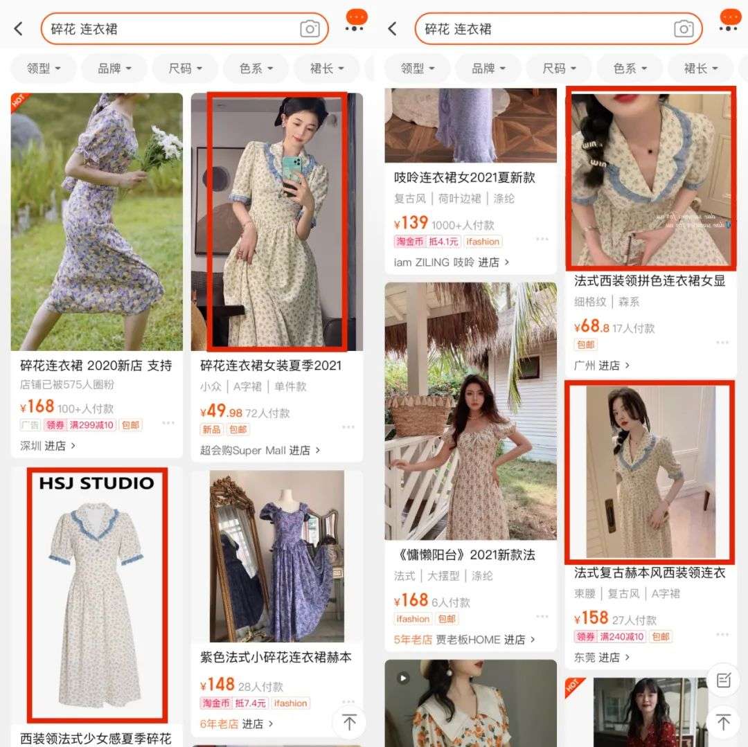另一边,消费者对搜索结果的兴趣也在不断降低,进而影响到直通车的曝光量。2017年左右,淘宝的搜索逻辑开始逐渐改变。以前,消费者能够轻而易举地检索到某类商品的不同款式,但在2017年之后,消费者发现,检索某类商品后,一旦先点击了某几款商品,而后搜索流里就会展现大量点击过的商品的同款。如搜索关键词“碎花连衣裙”,只要点击某几款连衣裙,后续的搜索结果中就会展示大量的同款链接。