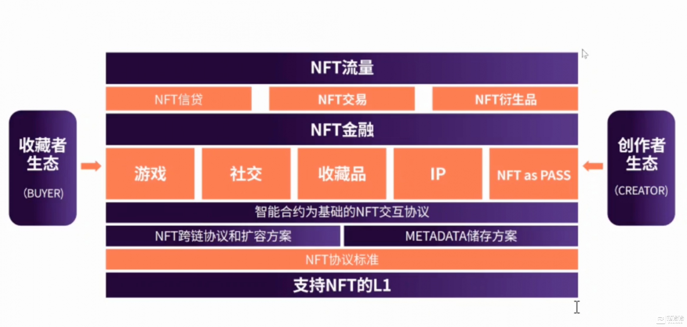 我们认为NFT生态分为这几个层面:支持NFT的L1、NFT协议标准、NFT跨链协议和扩容方案、METADATA存储方案、智能合约为基础的NFT交互协议,这是基础层,所有技术相关的东西都在这个区间。