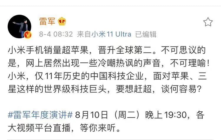 而对于这一迅速发酵的小米11质量问题,雷军于8月4日在微博上发布“小米手机销量超苹果,网上居然出现一些冷嘲热讽的声音,不可理喻!”