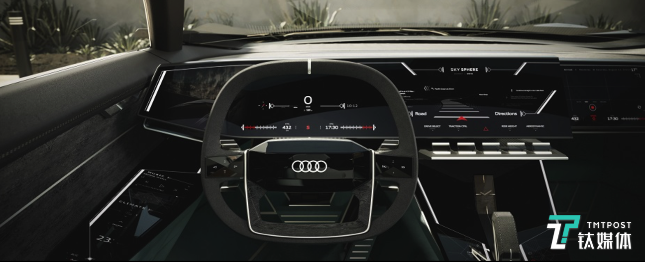 智能驾驶方面,奥迪skysphere概念车为L4自动驾驶(在某些特定的道路和交通场景下,驾驶者可将全部驾驶任务交予汽车,而不必再进行主动干预)而设计,所以方向盘和踏板等控制元件在自动驾驶模式下可被隐藏。