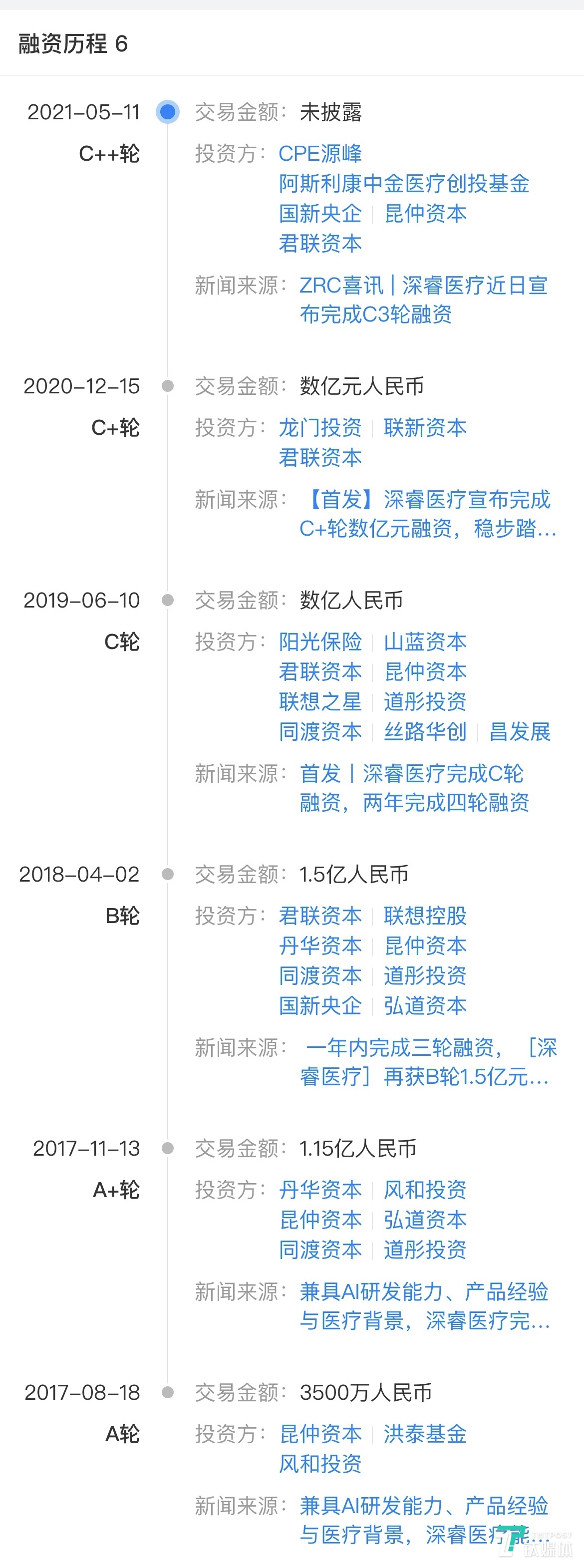 根据天眼查数据显示,过去四年,深睿医疗完成了六轮融资,其中包括阿斯利康中金医疗创投基金、联想控股、洪泰基金、君联资本等投资机构。动脉网发布的信息显示,深睿医疗的公司估值已达到50亿元人民币。